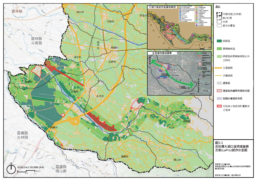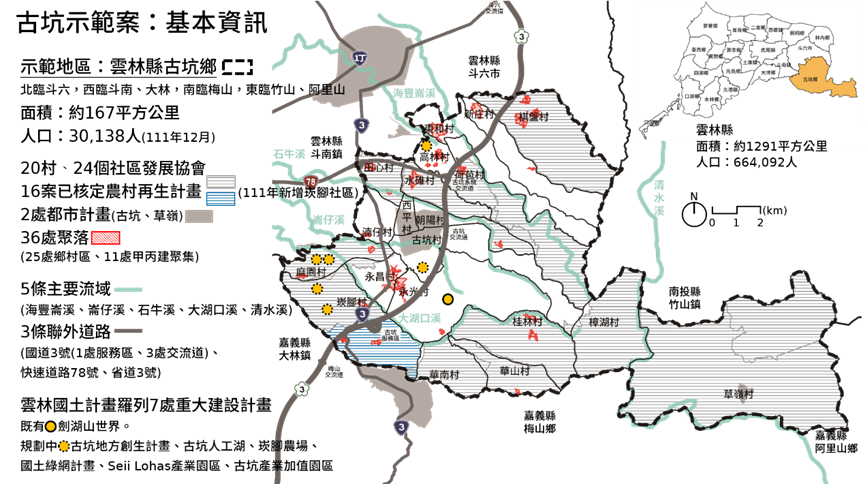 因應產業轉型,本鄉擬依有機農業促進法劃設「古坑麻園有機農業促進區」。然範圍內尚有台糖光電設施、且臨地之惟慣行農法或路殺等情形恐造成淺山生態物種棲地減少,皆會影響友善農業的長期經營。加之,有機農業促進區之劃設將於麻園村衍生一定規模之居住需求,甚至可能超出現行計畫提供之可建築用地。為回應有機農業促進之發展趨勢,本計畫以大湖口溪流域生態、生產及生活三生系統建構為主題,整合各部門資源、需求,研擬土地使用規劃策略。
