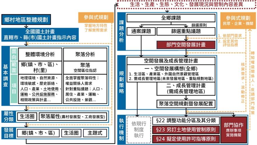 在規劃啟動之初,先以直轄市、縣(市)國土計畫給予本鄉之發展定位、空間發展構想、成長管理策略、部門空間發展計畫為框架,彙整地方創生、農村再生等相關計畫,蒐集人口、產業、土地使用、交通運輸、公共設施服務等二手資料,並輔以大數據疊圖分析更新即時資訊。接著,以前述資料為基礎,訪談在地人士,釐清動態生活圈、地方發展模式。該階段執行重點是以「地方共識度」、「計畫可行性」、「具急迫性或整合需求」等原則篩選出可優先處理的規劃主軸。