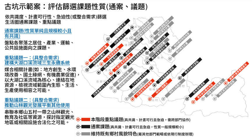 (三) 通案課題:針對本鄉建地不足、公共設施複合使用、農村體驗觀光發展等議題,另訂其土地使用管制原則。若已提出明確、具體需求,則放寬使用為免經或應經國土計畫主管機關同意使用。使用上與其他目的事業有衝突者,則依預先整合之共識,限縮為應經國土計畫主管機關同意始得申請使用。