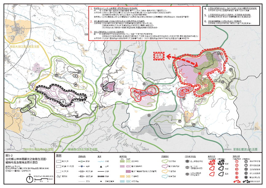 以觀光地區(草嶺石壁、萬年峽谷)指定、石壁竹創森計畫等目的事業計畫為推動本鄉山林觀光整體發展的關鍵驅動力。同時,為支持兼顧山林特色與生態保育的微型觀光發展,並因應地理環境及交通條件,應建構山區需求反應式運輸網路,於樟湖淺山深山交界及轉運之要衝優先建立交通服務節點。進而與華山咖啡大街、十字關遊憩區、石壁服務區及風景區遊憩用地、草嶺都市計畫等既有觀光資源,連綿形成本縣的山林生態觀光帶。