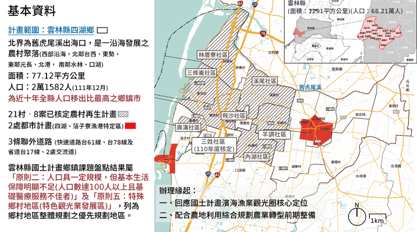本鄉面積約77.12平方公里(含海域範圍約93.31平方公里),下轄21村,包含2處都市計畫(四湖都市計畫、萡子寮漁港特定區計畫),48處聚落(36處鄉村區、12處甲丙建聚集)。依雲林縣國土計畫,屬「原則二:人口具一定規模,但基本生活保障明顯不足(人口數達100人以上且基礎醫療服務不佳者)」及「原則五:特殊鄉村地區(特色觀光業發展區)」,優先辦理鄉村地區整體規劃。