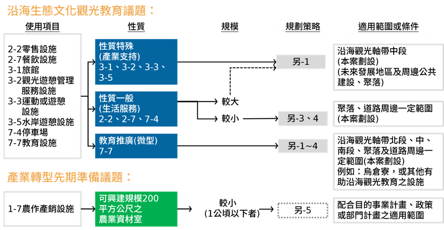 除了回應本鄉短中期的沿海觀光發展構想,亦配合農地利用綜合規劃、地方創生等部門空間發展計畫,提出有利於民間自主優化製儲銷環境之構想,作為前述長期推動農產業六級化與永續經營的先期準備。