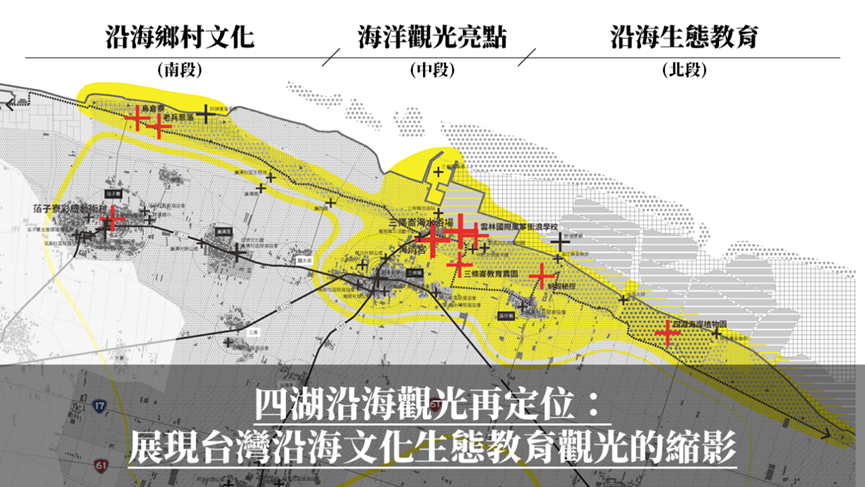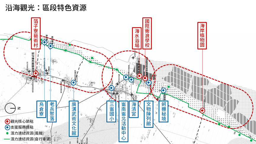 透過方案策劃(programming)與地方權益關係人確立沿海觀光未來發展規劃,可分為三個區段: